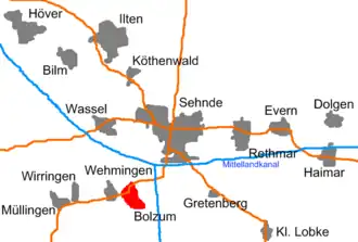 ![]() Die Lage von Bolzum im Stadtgebiet von Sehnde