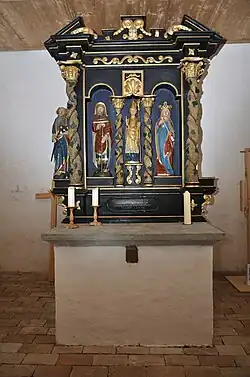 Der geschnitzt Altar von 1699 ist dem Hl. Bonifatius gewidmet und hat eine aufwendige Architektur mit gewundenen, mit Weinblättern und Trauben dekorierten Säulen und einem gesprengten Giebel. Er ist schwarz gefasst und mit vergoldeten Ornamenten geschmückt. Die drei Heiligenfiguren des Altars werden auf einer Seite flankiert von einer Skulptur des Apostels Paulus, sein Pendant auf der anderen Seit fehlt.