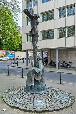 Kreuzigungsgruppe Henger Herrjotts Fott | 1989 | Aachen | Nachbau in Bronze einer im Krieg zerstörten steinernen Kreuzigungsgruppe aus dem Jahr 1897; Dialektname für „Hinter dem Hintern vom Herrgott“ |