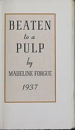 18. Madeline Forgue “Beaten to a Pulp.” Entworfen von Madeline Forgue, Schriftarten Linotype Granjon, Ludlow Eden Light und Cornet, gedruckt auf Worthy Hand and Arrows Papier von Black Cat Press.