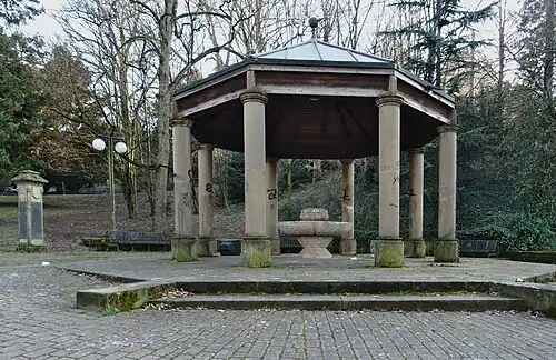 Ein achteckiger Säulenpavillon umgibt die kelchartige Travertinschale des Trinkbrunnens. Die Mineralwasserquelle des Brunnens wurde 1762 entdeckt. Seit 1951 wurde der Brunnen aus dem städtischen Trinkwassernetz gespeist. Später wurde der Brunnen stillgelegt.[1]
