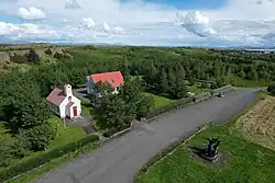 Vor der Kirche steht das 1985 errichtete Denkmal Sonatorrek von Ásmundur Sveinsson.[5] Es stellt Egill Skallagrímsson dar, der seinen toten Sohn Böðvar in den Armen hält. Der Name Sonatorrek (Die Trauer um die Söhne) stammt vom gleichnamigen Gedicht, welches Egill Skallagrímsson für seine beiden verstorbenen Söhne, Gunnar und Böðvar, geschrieben hat.