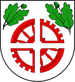 Blasonierung: „In Silber jeweils zwei Viertel eines roten Wagenrades und eines roten Mühlrades, schragenweise mit der Nabe auf einen gemeinsamen Mittelpunkt weisend aneinandergestellt; in den Oberecken zwei grüne Eichenzweige, jeweils aus zwei Blättern und einer Frucht bestehend.“[8]