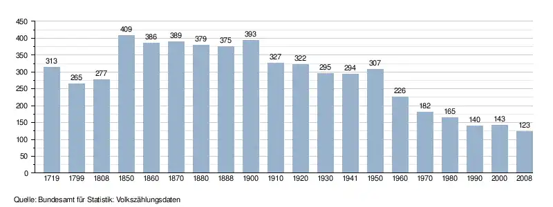 - ↑ Daten der Eidgenössischen Volkszählungen ab 1850 nach Gemeinden. (XLSX; 10 MB) Bundesamt für Statistik, Neuchâtel, 12. Juli 2024, abgerufen am 19. Januar 2025 (Öffnung in Excel nur über "Anhang/Excel-Datensatz" möglich).