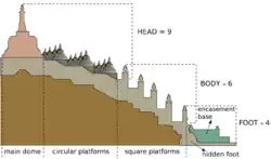 Die Architektur des Borobudur wurde in Übereinstimmung mit dieser Kosmologie gestaltet. Jeder Teil des Monuments ist einer anderen Welt gewidmet. Das Kamadhatu ist eine große rechteckige Wand außen am Fuß des Monuments. Über dieser Basis erhebt sich das Rupadhatu, das aus vier rechteckigen Terrassen mit Prozessionswegen besteht, die mit zahlreichen Statuen und 1300 szenischen und 1200 figurativen Reliefs dekoriert sind. Darüber erhebt sich das Arupadhatu, bestehend aus drei kreisförmigen Terrassen, in deren Zentrum sich eine große glockenförmige Kuppel erhebt. Gleich aus welcher Perspektive man das Bauwerk betrachtet – es ist immer schwierig, diese dreigliedrige Grundstruktur zu erkennen.