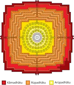 Gemäß der buddhistischen Kosmogonie ist das Universum in drei Welten unterteilt: Ārūpyadhātu (Sanskrit; Pāli Arūpaloka; tibetisch gzugs.med.pa'i khams), Rūpadhātu (Pāli: Rūpaloka; Tib: gzugs.kyi khams) und Kāmadhātu (Pāli: Kāmaloka; Tib: 'dod.pa'i khams). Kamadhatu, die „unterste“ Welt, ist die Welt der Menschen, die „Sinnenwelt“. Rupadhatu ist die Übergangswelt, in der die Menschen von ihrer körperlichen Form und weltlichen Angelegenheiten erlöst werden, die „Feinkörperliche Welt“. Arupadhatu schließlich, die Welt der Götter, ist die Welt der Perfektion und der Erleuchtung, die „Unkörperliche Welt“.