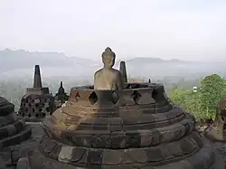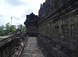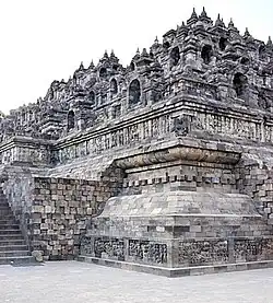 Der Borobudur wurde als Hügel mit einer inneren Steinfüllung erbaut und hat die Form einer Stufenpyramide. Wenn die Menschen ihre religiösen Aufgaben erfüllen wollten, so geschah dies in der freien Luft auf dem Umgang des Monuments. Auf vier Seiten führen Fluchten von Stufen und Aufgängen zur Spitze der Stufenpyramide.
