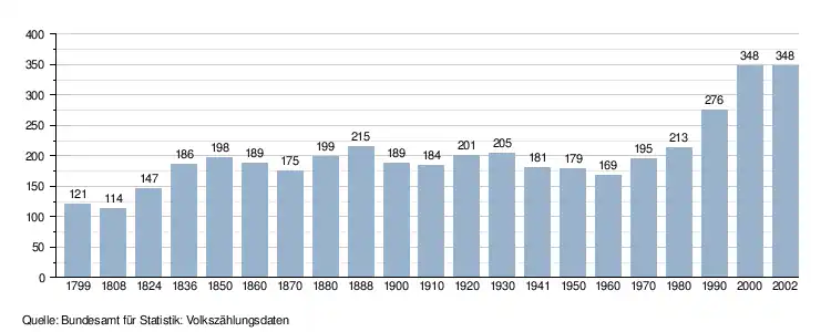 - ↑ Daten der Eidgenössischen Volkszählungen ab 1850 nach Gemeinden. (XLSX; 10 MB) Bundesamt für Statistik, Neuchâtel, 12. Juli 2024, abgerufen am 5. März 2025 (Öffnung in Excel nur über "Anhang/Excel-Datensatz" möglich).