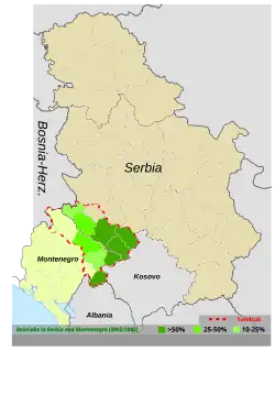 | Städte mit nennenswerter Bosnischer Bevölkerung | Novi Pazar, Tutin, Sjenica, Brodarevo, Prijepolje, Sjeverin, Opština Priboj, Belgrad |