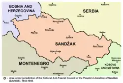 Während des Zweiten Weltkriegs wurde Sandžak ein umkämpftes Gebiet zwischen den Achsenmächten, Partisanen und Tschetniks. Im Banlaknfeldzug 1941 wurde das Königreich Jugoslawien von den Achsenmächten eingenommen. Die Bosniaken im Serbischen Teil des Sandzaks waren unter Italienischer und Deutscher Besatzung. Die Region war von politischen Unruhen, Widerstand und militärischen Auseinandersetzungen geprägt. Bosniaken litten unter Gewalt und Vertreibungen, besonders durch die Tschetniks.[15] Während die meisten Bosniaken die Partisanen unterstützten, schlossen sich einige aus dem Bedürfnis heraus, ihre Dörfer und Städte vor ethnischen Säuberungen zu schützen, den Achsenmächten an. Dies führte zur Bildung der „Muslimanska milicija Sandžaka (1941–1943)“, einer etwa 2000 Mann starken Miliz. Trotz der schwierigen Bedingungen gelang es den Bosniaken, ihre kulturelle Identität und Gemeinschaft zu bewahren[16]. Am 20. November 1943 wurde in Pljevlja der „Nationale Antifaschistische Rat zur Volksbefreiung von Sandžak“ (ZAVNOS) von Bosniaken und Serben gegründet. Dieses Gremium war während des Zweiten Weltkriegs das höchste politische Organ in Sandžak und leitete den antifaschistischen Widerstand in der Region. Die Mitglieder des ZAVNOS strebten nach der Schaffung eines autonomen Sandžaks innerhalb des kommunistischen Jugoslawien. Dennoch wurde die Region nach dem Krieg zwischen den Teilrepubliken Serbien und Montenegro aufgeteilt.[17][18] Trotz der herausfordernden Bedingungen hielten sie an ihrer kulturellen Identität und Gemeinschaft fest.[19]