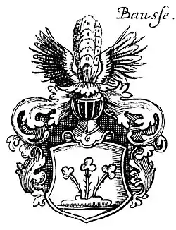 - ↑ Wappenschild ähnelt der Beschreibung nach dem derer von Dürfeld (ebenfalls Hallesches Pfännergeschlecht, entstammend dem Christoph von Dürfeld), wie er abgebildet unter dem Bausse-Wappen in: Genealogische Tabellen oder Geschlechts-Register sowohl derer vornehmsten im Saal-Creyse mit Ritter-Gütern angesessenen Adelichen Familien als auch derer vornehmsten alten und neuen, theils abgestorbenen, Adelichen, Patricien und Bürgerlichen Geschlechter zu Halle. Aus alten warhafften Documenten, Monumenten, Lehns-Registern, Lehn-Briefen, Actis publicis, Gerichts- und Kirchen-Büchern, Parentationen, Leich-Predigten und anderen Hülffsmitteln ... : Jn ordentliche Tabellen verfasset ... / Herausgegeben von Johann Christoph von Dreyhaupt, Halle 1750 Tafel XXVI.