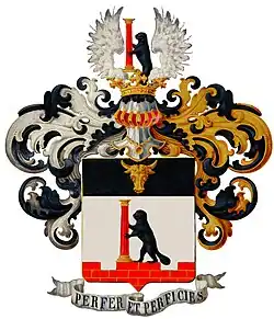 Das Wappen (1865 russisch, 1894 preußisch und 1916 sächsisch) zeigt unter schwarzem, mit einem goldenen vorwärtsgekehrten Stierkopf belegtem Schildhaupt in Silber auf roter, goldengefugter Zinnenmauer eine rote Säule mit goldenem Kopf und Sockel, an welcher ein schwarzer Biber anspringt. Auf dem gekrönten Helm mit rechts schwarz-silbernen, links schwarz-goldenen Decken zwischen geschlossenem, silbernem Flug der Biber mit der Säule in den Pranken wachsend. Ein silbernes Spruchband trägt in schwarzer Schrift den Wahlspruch: „Perfer et perfices.“[5]