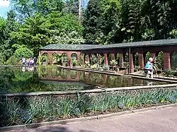 Nachdem Sie die Brücke überquert haben, betreten Sie eine halbkreisförmige Pergola, die zu den Seerosen- und Wasserpflanzenbecken führt. Auf der linken Seite, in der Nähe der Erfrischungsstelle, befindet sich ein Exemplar eines Choerospondias axillaris, einem eher seltenen Baum in europäischen Gärten. Es gibt drei Terrassen mit zahlreichen Blumenbeeten mit bunten saisonalen Blüten und Töpfen exotischer Pflanzen, die im Winter in Gewächshäusern gehalten werden. Die Terrassen werden von Wegen durchquert, die für die Öffentlichkeit gesperrt sind, dazwischen verläuft ein Kanal mit Wasserfällen. Auf der Spitze befindet sich eine Statue aus Bronze des neapolitanischen Bildhauers Vincenzo Gemito aus dem Jahr 1876.