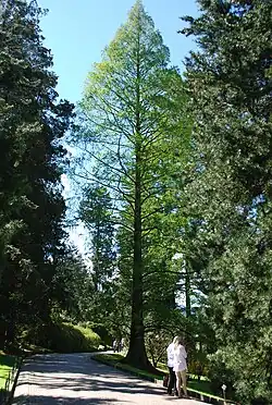 Nachdem Sie das Tor passiert haben, betreten Sie die Nadelbaumallee, die Exemplare aus aller Welt beherbergt, nach einem großen Exemplar der Weißtanne treffen Sie auf Exemplare von Cunninghamia lanceolata, Likiang-Fichte, Kaukasus-Fichte, Monterey-Kiefer, Lawsons Scheinzypresse, Stech-Fichte der Sorte Moerheim und der Sorte Koster, Pinus patula, Montezuma-Kiefer und zwei Schirmtannen, letztere sind sehr langsam wachsende Bäume, so dass die beiden großen Exemplare in der Allee von beträchtlichem Wert sind. Es folgen Exemplare von Küstenmammutbaum, Cryptomeria japonica und einige Exemplare Gewöhnlicher Douglasien, die eine Thujopsis dolabrata umgeben.