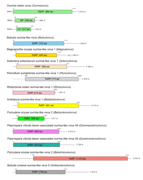 - Gattung Penoulivirus – infizieren Pilze (wie Magnaporthe, Botrytis) und Eipilze (Plasmopara) und Pflanzen (Äpfel)