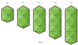 - ↑ Zu den beiden Endbausteinen (Halb-Ikosaeder, je 7 nm) kommen n=2, 3, 4 oder 6 Zwischenbausteine (englisch double disks, je 8 nm); das sind