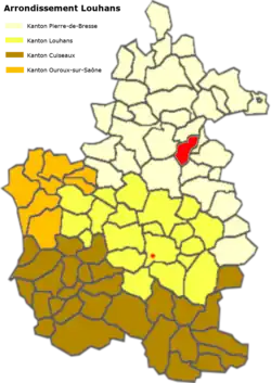 Der Bourg wird durch die Departementsstraße D58 erschlossen, im westlichen Gemeindegebiet verläuft die Départementsstraße D137 von Saint-Germain-du-Bois nach Bellevesvre. Bei dieser Trasse handelt es sich um eine ehemalige Römerstraße, die von Louhans nach Pierre-de-Bresse führte. Die Gemeinde weist lediglich im Süden eine größere zusammenhängende Waldfläche auf, einzelne kleinere Flächen befinden sich im Nordteil der Gemeinde. In den Auengebieten entlang der Brenne finden sich zahlreiche Pappelplantagen. Zur Gemeinde gehören folgende Weiler und Fluren: les Amis, les Arbois, la Balme, Bougnolles, les Burdys, le Champ-de-Foire, les Chênes, la Communauté, les Crouses, les Genots, la Glacière, Granges-Bonnots, les Grappins, les Grépilles, la Grille, Heurarde, l’Isle, la Malmontée, les Marronniers, le Moulinot, le Parc, le Petit-Bois, les Philippes, les Plateaux, le Rapillot, le Vernet, Villeneuve[5].