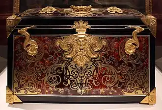 - 1684 Truhe cabinet de marqueterie en forme de tombeau in Boullemarketerie (countre-partie) nach Motiven von Jean Louis Berain, angefertigt für Ludwig von Frankreich, Le Grand Dauphin (* 1661; † 1711), jetzt in den State Apartments in Blenheim Palace sowie (première-partie) und (countre-partie) im Getty Museum in Los Angeles (Abb. siehe unter Sammlungen, Link Getty Center).
