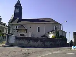 - Kirche, gewidmet Rochus von Montpellier. Die Bauweise lässt auf eine Errichtung in der Frühen Neuzeit schließen. Das Eingangsportal an der Südseite mit seinem Kielbogen oberhalb erscheint wie eine Nachbildung der gotischen Kirchenportale in Nay, Igon oder Asson. Ausstattungsgegenstände sind u. a. eine hölzerne Statue aus dem 17. Jahrhundert, die die Madonna mit Jesuskind verkörpert und ein Altaraufsatz aus dem 18. Jahrhundert. Dieser enthält eine Darstellung der Kreuzigung Jesu Christi und zeigt ein Attribut des Schutzpatrons, einen eingerollten Hund mit einem Stück Brot im Maul, das er der Sage nach dem heiligen Rochus brachte, weil dieser an der Pest erkrankt war.[7] Auf einer der Wände ist ein Christusmonogramm zu sehen. Üblicherweise enthält ein solches Symbol neben meist stilisierten klassischen Zeichen des griechischen Alphabets Chi („X“) und Rho („P“) für die ersten Buchstaben des griechischen Worts Xristos (deutsch Christus) oft zusätzlich die Zeichen für Alpha und Omega. Bei diesem Christusmonogramm rollt sich zusätzlich der Anfangsbuchstabe von Salvator(deutsch Retter) um das „P“ zum Zeichen der Rettung der Menschheit durch die Kreuzigung Jesu Christi.[8]