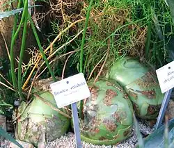 Bowiea volubilis, Habitus und Blüten, rechts ist die grüne Knolle. | ||||||||||||