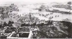 Die internationale Truppe nahm Tianjin schließlich am 14. Juli ein. In der „Schlacht von Tianjin“ erlitt die internationale Truppe ihre schwersten Verluste.[93] Von Tianjin aus marschierte sie mit 20.000 verbündeten Soldaten etwa 120 km weit nach Peking. Am 4. August waren etwa 70.000 kaiserliche Truppen der Qing und 50.000 bis 100.000 Boxer auf dem Weg. Die Verbündeten stießen nur auf geringen Widerstand und kämpften bei Beicang und Yangcun. In Yangcun führte das 14. Infanterieregiment der US-amerikanischen und britischen Truppen den Angriff an. Das Wetter stellte ein großes Hindernis dar: Die hohe Luftfeuchtigkeit, die Temperaturen von bis zu 42 °C und die Insekten sorgten dafür, dass die Soldaten dehydrierten und viele ihrer Pferde starben. Alliierte Truppen, die nach Brunnen suchten, wurden von chinesischen Dorfbewohnern getötet.[94]