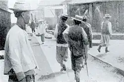 Ebenfalls am 11. Juni wurde der erste Boxer im Gesandtschaftsviertel gesichtet. Der deutsche Gesandte Clemens von Ketteler und deutsche Soldaten nahmen einen Boxerjungen gefangen und richteten ihn auf unerklärliche Weise hin.[43] Als Reaktion darauf drangen Tausende von Boxern am Nachmittag in die ummauerte Stadt Peking ein und brannten viele der christlichen Kirchen und Kathedralen der Stadt nieder, wobei einige Menschen bei lebendigem Leib verbrannten.[44] Amerikanische und britische Missionare hatten sich in die Methodistenmission geflüchtet und ein Angriff dort wurde von amerikanischen Marinesoldaten abgewehrt. Die Soldaten der britischen Botschaft und der deutschen Gesandtschaft erschossen mehrere Boxer, was die chinesische Bevölkerung der Stadt verärgerte und die Qing-Regierung dazu brachte, die Boxer zu unterstützen.[45]