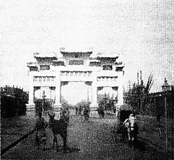 Am 5. Juni 1900 wurde die Bahnstrecke nach Tianjin von Boxern auf dem Land unterbrochen und Peking war isoliert. Am 11. Juni wurde der Sekretär der japanischen Gesandtschaft, Sugiyama Akira, am Yongding-Tor von den sogenannten Gansu-Kriegersoldaten unter General Dong Fuxiang überfallen und getötet.[38] Dongs Truppen, die mit Mausergewehren bewaffnet waren, aber traditionelle Uniformen trugen,[39] hatten im Herbst 1898, kurz nach ihrer Ankunft in Peking,[40] die ausländischen Gesandtschaften so sehr bedroht, dass Marinesoldaten der Vereinigten Staaten zur Bewachung der Gesandtschaften nach Peking gerufen wurden.[41] Der deutsche Kaiser Wilhelm II. war über die chinesischen muslimischen Truppen so beunruhigt, dass er den osmanischen Sultan Abdülhamid II. bat, einen Weg zu finden, die muslimischen Truppen vom Kampf abzuhalten.[42]