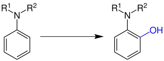 Die blau eingezeichnete phenolische OH-Gruppe in ortho-Position ist durch die Boyland-Sims-Oxidation eingeführt worden. Sind beide ortho-Positionen im Edukt besetzt, bildet sich ein para-Aminophenol.