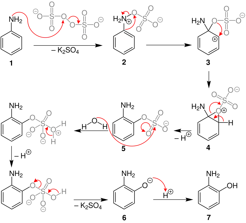 Das freie Elektronenpaar des Stickstoffatoms vom Anilin (1) greift eines der beiden instabilen Sauerstoffatome der Peroxidgruppe vom Kaliumperoxodisulfats an und spaltet dabei Kaliumsulfat ab. Dabei entsteht ein Phenylammoniumsulfat 2. Nun findet der ipso-Angriff der Sulfatgruppe statt, durch die das stabilere Zwischenprodukt 3 gebildet wird und dearomatisiert wird. Durch die Spaltung der Doppelbindung entsteht ein Carbeniumion in ortho-Stellung und dadurch eine Epoxidgruppe 4. Das Wasserstoffatom der Epoxidgruppe 4 spaltet sich ab und rearomatisiert zum ortho-Aminophenylsulfat 5. Durch den Angriff von Wasser an der Sulfatgruppe entsteht über mehrere interne Mechanismen das ortho-Aminophenolat 6. Durch Protonierung des Phenolates wird das Endprodukt ortho-Aminophenol (7) gebildet.