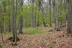 - Waldmeister-Buchenwälder und Orchideen-Kalk-Buchenwälder mit stabilen größeren Vorkommen von Leberblümchen und Märzenbecher;[6] die Buchenwaldvaritäten nehmen zusammen knapp zwei Drittel der FFH-Fläche ein und prägen das Schutzgebiet. Dort sind eine Vielzahl von Vogelarten und der Orchideenreichtum prägend.[5]
