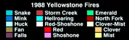 | Snake River | Yellowstone Lake, Red Mountains, Lewis Lake, West Thumb | 172.025 Acres (696 km²) | 23. Juni 1988 | 19. September 1988 |