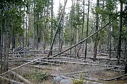 In den Wäldern im Yellowstone dominiert die Küsten-Kiefer (Pinus contorta), die nach 80 bis 100 Jahren, wenn der Wald reift, durch andere Baumarten ersetzt wird.[19] Im Yellowstone kann die Küsten-Kiefer dank einer sehr kurzen Wachstumsperiode aufgrund der Höhenlage und relativ kargen Böden fast dreihundert Jahre alt werden, bevor sie von anderen Baumarten wie Engelmann-Fichte (Picea engelmannii) oder Felsengebirgs-Tanne (Abies lasiocarpa) abgelöst wird.[19] Die Küsten-Kiefern, die im gesamten Hochland des Yellowstone-Plateaus zu finden sind, wachsen in ununterbrochenen dichten Beständen mit durchschnittlich ähnlichem Alter in verschiedenen Gruppierungen. In den 1980er-Jahren waren viele der Küsten-Kiefern-Wälder im Yellowstone-Nationalpark zwischen 200 und 250 Jahre alt und näherten sich dem Ende ihres Lebenszyklus.[18]