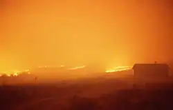 Zwischen Juni und August brachen im Yellowstone-Nationalpark und den umliegenden Nationalwäldern fast 250 verschiedene Brände aus. Sieben davon waren für 95 % der gesamten Brandfläche verantwortlich.[26][14] Ende Juli hatten der National Park Service und andere Behörden das verfügbare Personal vollständig mobilisiert, dennoch breiteten sich die Brände zunächst weiter aus. Kleinere Brände gingen ineinander über, angetrieben von trockenen Stürmen, die Winde und Blitzeinschläge, aber keinen Regen mit sich brachten. Am 20. August, dem mit Abstand schlimmsten Tag der Brände, der später als „Schwarzer Samstag“ (engl.: Black Saturday) bezeichnet wurde, wurden bei einem der vielen intensiven Brände mehr als 610 km² (150.000 Acres) an Land vernichtet.[26] Asche von den Bränden im gesamten Park wurde bis ins 97 km nordöstlich gelegene Billings, Montana, getragen.[27] Die windgetriebenen Flammen sprangen über Straßen und Brandschneisen hinweg, und die brennende, weithin sichtbare Glut löste bereits mehr als einen Kilometer vor der Hauptfeuerfront neue Brände aus.[28] Bodenbrände stiegen in das Kronendach des Waldes auf und erreichten Höhen von über 60 m. Während des Sommers breiteten sich die Brände über Distanzen von 8 bis 16 km pro Tag aus, in Fällen wurde von mehr als 3 km in einer Stunde berichtet.[28]