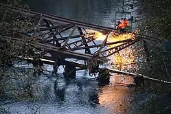 Am 1. Dezember 2014 begannen vor Ort die Vorarbeiten für den Rückbau der Brücke. Sie sollte ursprünglich mittels einer Schneidsprengung kontrolliert ins Wasser abgelassen werden. Doch bei Erleichterungsarbeiten an der Brücke wurde sie so instabil, dass sie sofort per Schneidbrenner abgeschnitten und kontrolliert ins Wasser abgelassen wurde. Anschließend wurden ihre Einzelteile der Verwertung zugeführt.