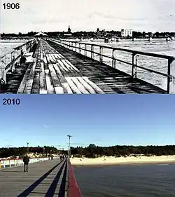 1882 organisierte Graf Juozapas Tiškevičius den Umbau der Seebrücke. Man benutzte sie hauptsächlich zum Export von Ziegelsteinen, für deren Transport zum Hafen Palanga eine Straßenbahn eingerichtet wurde. Im Sommer diente die Seebrücke als Flaniermeile. Man baute Altane zum Schutz vor dem Regen.[1] Ab 1892 benutzte man die Brücke nur noch als Fußgängerzone. Im August 1899 gab es an der Brücke die Premiere des ersten litauischen Theaterstücks „Amerika im Dampfbad“ (lit. Amerika pirtyje) von Keturakis.