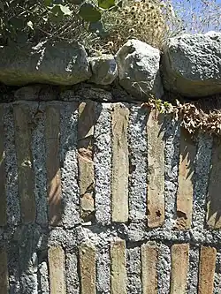 Die Ziegel der Segmentbögen bestehen aus gelb-rotem Ton, dem feiner Ziegelsplitt beigemischt wurde.[13] Die rechteckigen Platten haben ein Format von 40 × 50 cm, sind ca. 5 cm dick und stehen mit der kürzeren Seite aufrecht im Bogenverband, so dass die doppelt aufgemauerten Bögen eine Gesamtdicke von 80 cm besitzen.[13] Das Bindematerial in den 4 cm dicken Fugen ist harter Kalkmörtel mit einem Zusatz von grobem Ziegelsplitt und feinem Kies.[13] Die beiden Halbkreisbögen wurden mit etwas kleineren Ziegeln gemauert, stellenweise wurden auch die Originalziegel des zerstörten Segmentbogens wiederverwendet.[13] Die Kämpfersteine sind glatt behauene Kalksteinquader mit schräger Auflagefläche für den Bogenansatz.[23]