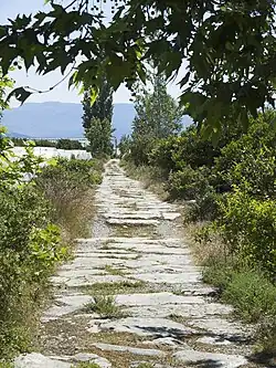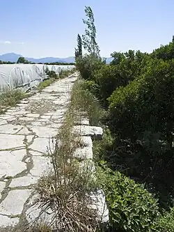 Nur 30–40 cm über dem Scheitelpunkt der Bögen befindet sich das aus großen und unregelmäßigen Kalksteinplatten bestehende Brückenpflaster, das beidseitig 10 cm über den Brückenrand vorsteht.[8] Die Verwendung kleiner Flusskiesel als Pflasterung lässt auch hier Reparaturmerkmale an den beiden Halbkreisbögen erkennen.[8] Der Brückenweg ist 3,55 bis 3,70 m breit und vergrößert sich an den Brückenenden auf 4,30 m.[8]