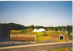 Vor der Escarpe des Brückenkopfes liegt ein breiter, wassergefüllter Graben. Hinter der Escarpe befindet sich eine durchgehende Galerie mit zahlreichen Scharten für die infanteristische Verteidigung. Dem Bauwerk waren mehrere Wassergräben und ein ausgedehntes Glacis vorgelagert.
