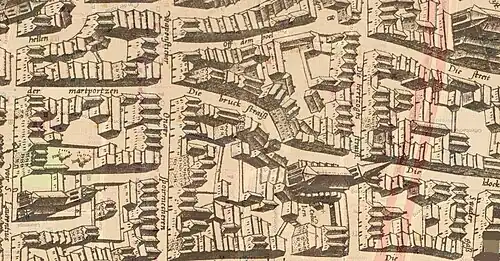 Der Straßenname zu Römerzeiten (lateinisch supra pontem) erinnert an die im Juli 1417 gegründete Deutzer Fähre, deren Anlegestelle weiter östlich rheinwärts in Höhe der Brückenstraße lag.[9] Die Besiedlung der Straße im Umfeld von St. Kolumba begann jedoch später, als der damals wohl reichste und mächtigste Bürger Kölns, Gerhard Scherfgin, ab September 1301 dort das „Haus de Strungede“ besaß.[10] Sigbert Louvenberg erbaute 1388 „Haus Groenendal“ an der damals noch „Up der bruggen“ heißenden Brückenstraße (Nr. 12).[11] Im Jahre 1400 erwarb Wilhelm Grin das „Haus Graloch“ in der Brückenstraße („zer Brueghen“). Das benachbarte „Haus Arck“ befand sich seit 1403 im Eigentum der Witwe Jutta von der Arken, nachdem ihr Gatte Hermann verstarb. Zu jener Zeit hieß die Straße „Up der Bruggen“. Gerhard von der Hennen kaufte 1408 vier Steinhäuser gegenüber der Kirche St. Kolumba. Seit November 1439 wohnte Ritter Johann Hirtze im „Haus zum Grin“ („großes Haus zum Grin“ oder „Gryn“; Nr. 8–10), seit Februar 1475 war ein Johann van Hielden im „Haus zum Paradies“ auf der Brückenstraße Nr. 5 gemeldet.[12] Im August 1446 erwarb der Maler Everhard Treynkin das neben dem „kleinen Haus zum Grin“ stehende Haus (Nr. 1–3), das 1469 die Witwe Aleyd Treynkin als Erbin übernahm. Am 25. Juli 1470 übertrug Johann Hirtze die Häuser „Nuwenberg“ und „Koggen“ an Godert von Wasservasse, der sie am selben Tag zurück übertrug (Scheingeschäft).