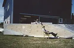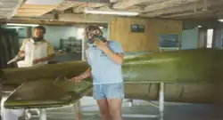 Dale (links) und Alan sprühen im Keller der Scheune Polyesterharz auf die Form der VK-30 (circa 1985)
