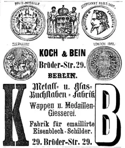 Nachdem Eduard Humbert und seine Frau gestorben waren, wurde das Haus 1868 an Ernst Benjamin Koch verkauft. Dieser richtete in der Brüderstraße 29 die Metall- und Glasbuchstabenfabrik Koch und Bein ein, die 1857 gegründet worden war, sich vor dem Umzug für kurze Zeit im Haus Brüderstraße 11 befunden hatte und offenbar ursprünglich in der Neuen Friedrichsstraße 49 angesiedelt gewesen war.[15] Koch und Bein produzierten unter anderem Firmenschilder, außerdem stammten die Stationsschilder fast aller Eisenbahnen in Deutschland von dieser Firma.[16] Koch schmückte die Fassade mit allerlei Schildern, Medaillen und Wappen sowie mit anderthalb Meter hohen freiplastisch in Zinkguss dargestellten Männern aus dem preußischen Wappen. Besondere Mühe mit der Dekoration gab er sich anlässlich der Siegesfeier nach dem Deutsch-Französischen Krieg: Koch und Bein errichteten vor dem Haus eine auf Säulen ruhende Kuppel, die die deutsche Kaiserkrone trug. Die Außenseiten waren mit den Wappen der deutschen Fürsten und freien Städte verziert, die sich an dem Krieg beteiligt hatten. Vier Türme mit Nischen, in denen Statuen des Kaisers, des Kronprinzen, Bismarcks, Moltkes und Roons standen, umgaben diesen Tempel, der außerdem mit Bannern, Fahnen und Medaillen geschmückt war. Innen befanden sich das preußische Wappen, riesige Schildhalter und diverse Gedenktafeln.[17]