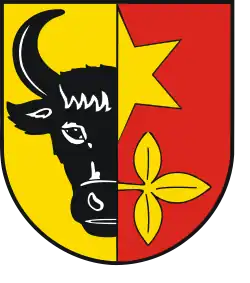 Blasonierung: „Gespalten; vorn in Gold ein halber hersehender schwarzer Stierkopf am Spalt; hinten in Rot ein halber goldener Stern am Spalt, darunter ein aus dem Spalt hervorkommendes gestieltes goldenes Dreiblatt.“[27] |
