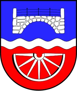 Blasonierung: „Von Blau und Rot durch einen silbernen Wellenbalken geteilt. Oben schwebend eine aus unbehauenen Granitsteinen gemauerte, oben mit einem Eisengeländer abschließende silberne Brücke, unten ein schwebenden, unterhalbes silbernes Wagenrad.“[9]