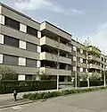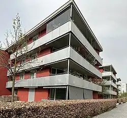 | 10 | Rock on | Baubeginn 2007[34] Bezug 2008[31], zwei viergeschossige Gebäude, 47 Wohnungen (Miete) um einen seitlich offenen Hof[35] 2011 musste die Tiefgarage saniert werden, da aussergewöhnliche Risse auftraten.[36] |