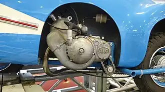Der Motor der Brütsch Mopetta ab der ersten Jahreshälfte 1957: Links außen liegend und von Ilo zugeliefert. Gut sichtbar: Der ungewöhnliche, am Hinterrad auch außen angelenkte Ausleger des hinteren Achsrohrs
