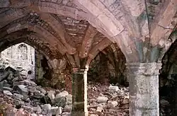 - ↑ “the very foundations of this fair church are now, 1666, digged up, where I saw several freestone coffins ... and several capitalls and bases of handsome Gothique pillars. On the west end of the hall was the King’s lodgeings, which they say were very noble, and standing about 1588.” (Aubrey)