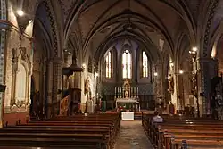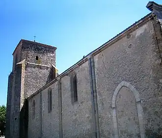 - Die Apsis und der auf der Nordseite der Kirche befindliche, gedrungen wirkende Glockenturm der Église Saint-Julien et Sainte-Basilisse werden dem ausgehenden 13. Jahrhundert zugerechnet; beide sind seit 1932 als Monument historique eingestuft.[12] Große Teile des Langhauses stammen jedoch erst aus dem 17. Jahrhundert; im 19. Jahrhundert wurde die Kirche um zwei Joche nach Westen verlängert, so dass die gotisch anmutende Fensterrose und das Portal der Westfassade mit dem ursprünglichen Zustand nichts mehr zu tun haben. Im Innern ist es eine einschiffige Kirche mit Seitenkapellen und breiten Schwibbögen, auf denen eine hölzerne Dachverschalung aufruht; die spätgotische Apsis ist dagegen rippengewölbt. Die Ausmalung wurde nach der Verlängerung des Bauwerks im 19. Jahrhundert angebracht. Die Anerkennung des Kirchenschiffs als Monument historique erfolgte im Jahr 1987.[13]