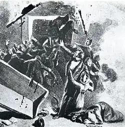Aufgrund ihrer Bauweise erwies sich die Kirche als Brandfalle. Mindestens 113 Menschen kamen in den Flammen um, in manchen Darstellungen ist von 116 oder 117 Todesopfern die Rede.[1][3][4] Unter den Opfern befanden sich lediglich acht erwachsene Männer. Offiziell bestätigt wurde der Tod von 69 Frauen und 36 Kindern unter 15 Jahren.[4] Diese ungleichmäßige Verteilung hatte ihre Ursache darin, dass Männer und Frauen unterschiedliche Kircheneingänge benutzten. Über den Südausgang konnten viele Männer ins Freie gelangen, der Westeingang der Frauen war jedoch versperrt. Auf den Emporen hatten Mägde, anderes Dienstpersonal und unverheiratete Frauen Platz genommen.[2]