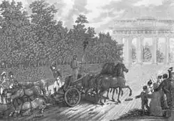 Nach den gewonnenen Befreiungskriegen marschierte die preußische Armee am 31. März 1814 in Paris ein. Am 4. April meldete der Feldmarschall Gebhard Leberecht von Blücher[62] (laut einer anderen Quelle General-Kriegskommissar Friedrich von Ribbentrop)[65] nach Berlin, dass die Quadriga gefunden sei und der König ihre unverzügliche Rückführung nach Berlin befohlen habe. Die Quadriga wurde in 15 Kisten verpackt und Anfang April 1814 auf dem Landweg über Compiègne, Noyon, La Fère, Saint-Quentin (21. April), Beaumont, Brüssel (4. Mai), Louvain, Tirlemont, Saint-Trond, Lüttich (8. Mai), Aachen (9. Mai), Jülich, Düsseldorf (10. Mai), Elberfeld (12. Mai), Schwelm, Hamm (16. Mai), Bielefeld (20. Mai), Minden (22. Mai), Hannover (24.–27. Mai), Halberstadt (1. Juni), Schönebeck, Magdeburg, Brandenburg/Havel, Werder und Potsdam (8. Juni) zurück nach Berlin geschickt. Der Führer dieses Zuges und der preußischen Geleitmannschaften, Rittmeister von Machui, hat darüber in Soldatenfreunde (im Jahr 1848) berichtet.[66] Da die hochbepackten Wagen in Louvain, Tirlemont, Sint-Truiden und Aachen die Stadttore nicht passieren konnten, sollen diese kurzerhand eingerissen worden sein,[67] wobei diese Aussage zumindest zweifelhaft ist.[68] Auf preußischem Gebiet, also ab Düsseldorf, geriet der von Blücher begleitete Transport zu einem Triumphzug. Die Wagen wurden jubelnd begrüßt und mit Girlanden und patriotischen Inschriften geschmückt. Sie trafen am 9. Juni in Zehlendorf bei Berlin ein. Die Quadriga wurde zur Restaurierung in das Jagdschloss Grunewald gebracht. Die Küche im Ostflügel des Schlosses wurde dafür in eine Schmiede umgebaut.[65]
