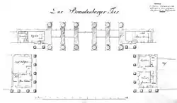 Mit der Erweiterung der Dorotheenstadt nach Westen und dem Bau der Zollmauer der Stadt Berlin wurde 1734 ein Vorgängerbau an der Stelle des heutigen Brandenburger Tores als Stadttor an der Straße nach Brandenburg an der Havel durch Philipp Gerlach errichtet.[5] Die Toranlage bestand aus zwei mit Pilastern und Trophäen geschmückten barocken Pylonen, an denen die Torflügel befestigt waren. Neben dem Schmucktor befanden sich einfache Durchgänge für Fußgänger in der Mauer, die an dieser Stelle mit Schmuckvasen verziert waren.[5] Bereits innerhalb der Zollmauer befanden sich südlich des Tores das Gebäude für die Wache und nördlich das für die Steuerbehörde.